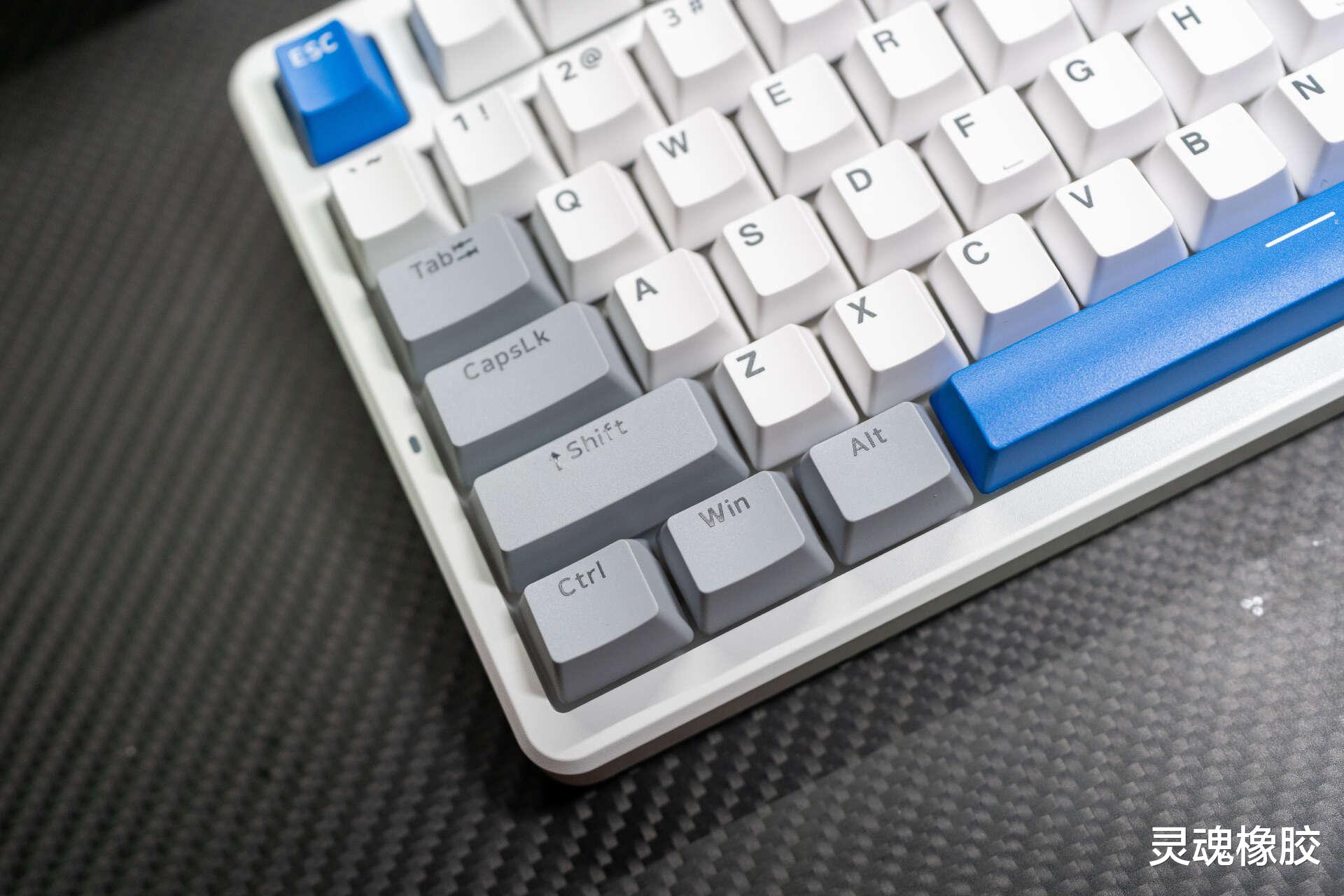 98配列既满足了对小键盘有需求的人群,又压缩了键盘对桌面的占用面积,这款键盘一共有三个配色可选,分别是初号骑士、莫奈仙踪和幻影机甲,三种配色分别以黑灰绿、蓝灰粉和蓝白灰色彩搭配组成,非常的漂亮,我选的是幻影机甲配色,键盘以白色为主,配以灰、蓝色作为点缀,有一种复古的感觉,很漂亮、