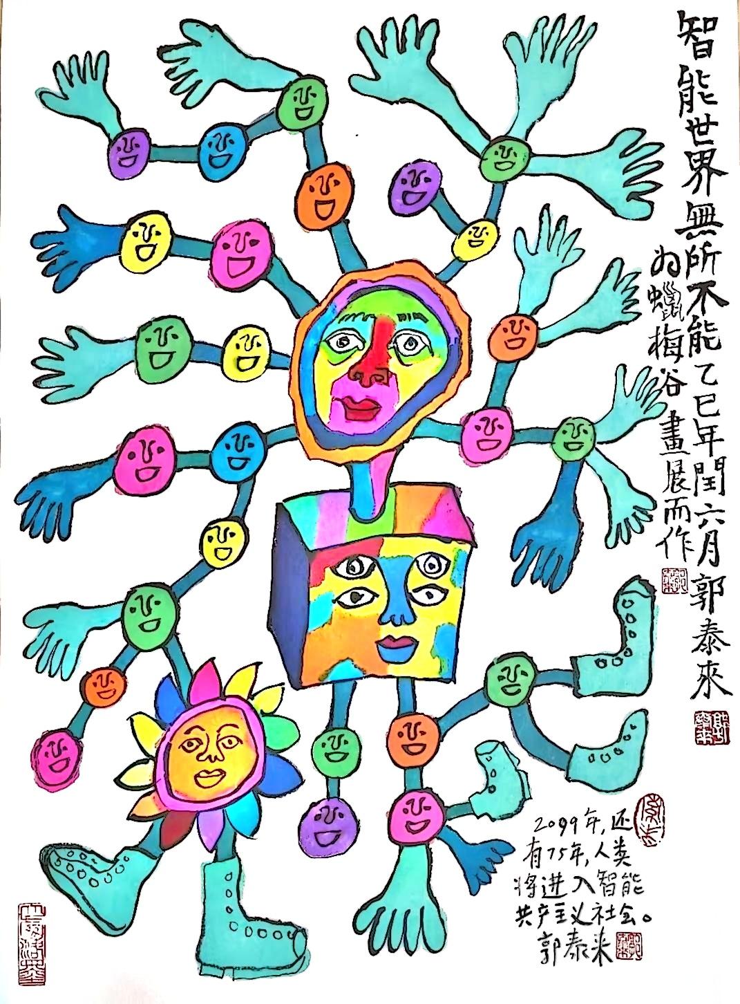 未来世界已让人类突破了时空的羁绊,精神能够在虚拟与现实之间自由穿梭(他也称之为智能共产主义)。郭泰来的“永生主义”艺术作品,就仿佛是从那个遥远的未来投射到现实世界的影像。他笔下那些线条流畅、造型奇异的形象,或许象征着未来人类经过进化后的全新形态;色彩斑斓却又充满神秘氛围的画面,恰似未来世界中多元文化与先进科技相互交融的奇妙景象。