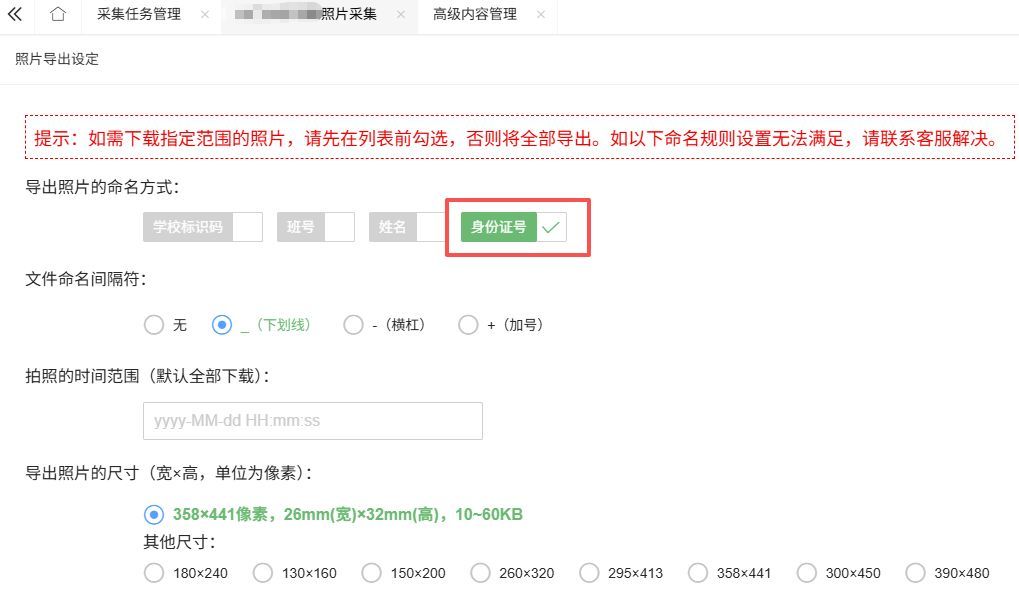目前很多学校在使用“校园证件照采集平台”进行学生学籍照片采集过程中,为了保护学生隐私,会选择将身份证号等敏感信息脱敏或加密后导入平台,例如只保留身份证后6位,或将中间生日部分用星号代替。但在照片下载后往往遇到一个问题:照片要求用”姓名_身份证号.jpg“命名,如何还原呢?下面以此场景为例,介绍校园证件照采集平台提供的《照片批量重命名》工具的使用。