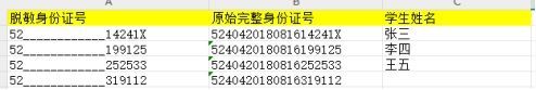 2、准备一个Excel表,里面包含了脱敏的身份证号、原始完整的身份证号、学生姓名。注意,脱敏身份号中间是“_”。