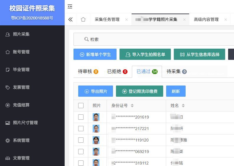 首先,学校是采用自己在Excel表里脱敏的方式,将身份证中间部分隐去后导入校园证件照采集平台拍照采集的:
