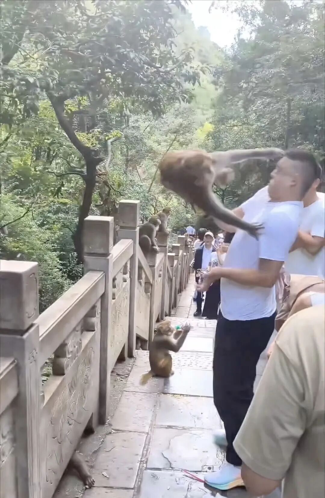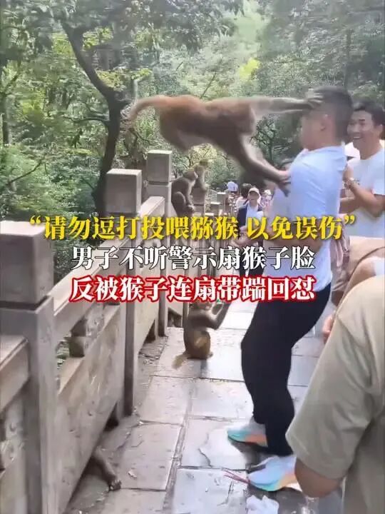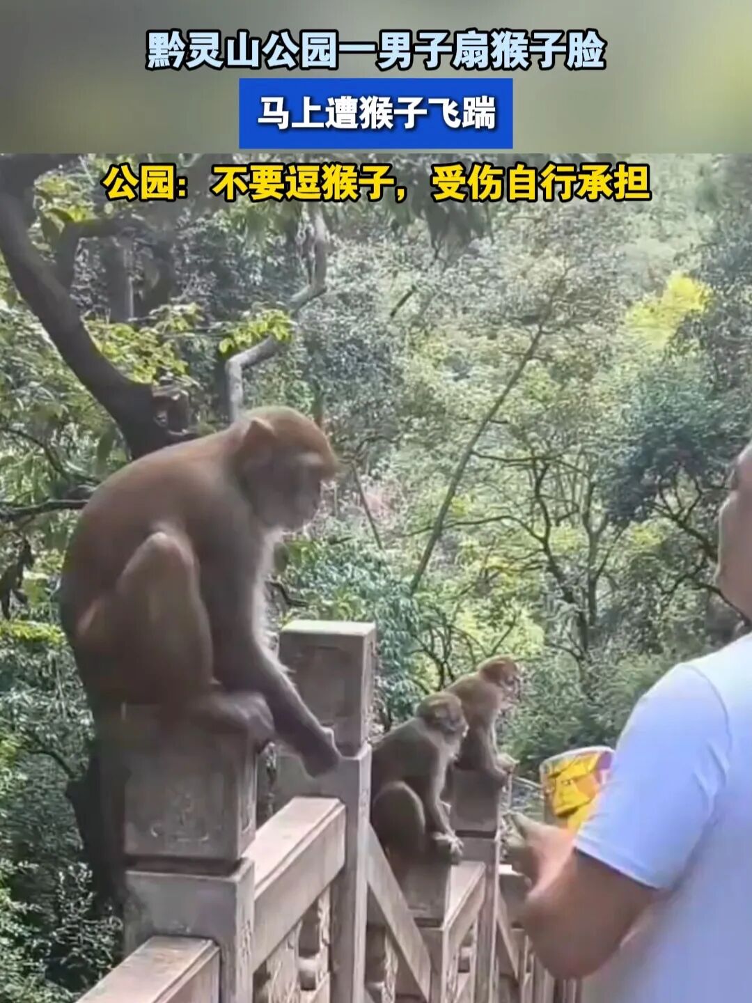 掌掴猕猴瞬间遭飞踹反杀,黔灵山游客手欠被踹倒地鼻部受伤流血:野生猕猴属国家二级保护动物,游客被警方口头警告并登记备案