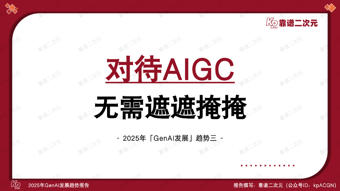 2025年,AIGC(人工智能生成内容)经历了蓬勃发展,使得大多数互联网用户对AIGC内容不再陌生。大量GenAI的内容涌现,平台对这些内容的标记更加成熟和广泛,加之权威媒体对AI内容进行全面推广,使得公众对AIGC的态度从新奇和不屑一顾转变为习惯和接受。
