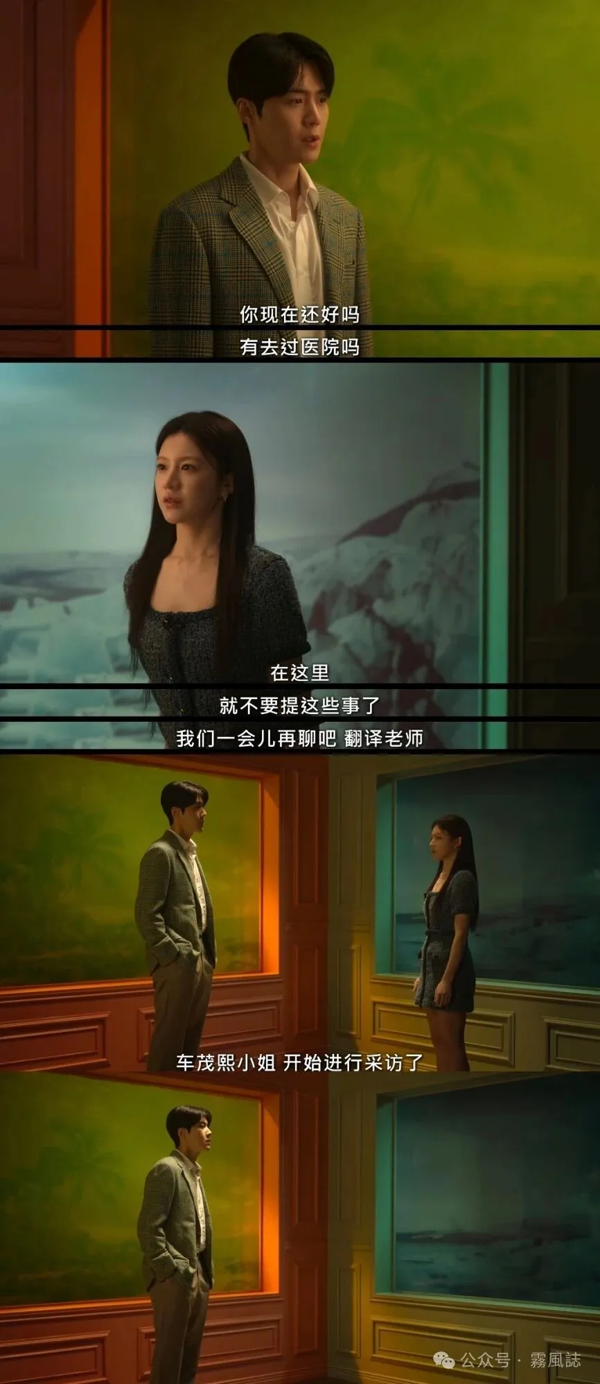 细节二:第3集两人因节目再次相见时,私下对话的场景,周浩镇主动关心车茂熙身体状态,而她表现出回避、划清界限,因为她不想谈论自己的“弱点”。