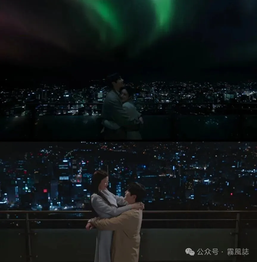 然而在12集车茂熙带周浩镇来她喜欢的地方看夜景时,仔细观察两处场景的护栏,这是在同一个地方拍摄的!两处都一样是拥抱、亲吻的场景,虽然客观角度韩国看不到极光,但极光已经在他们心里、随时都能看见,车茂熙当时想象中的场景这不就显化了吗?极光不是错觉,幸福也不是妄想,它们都真实存在!