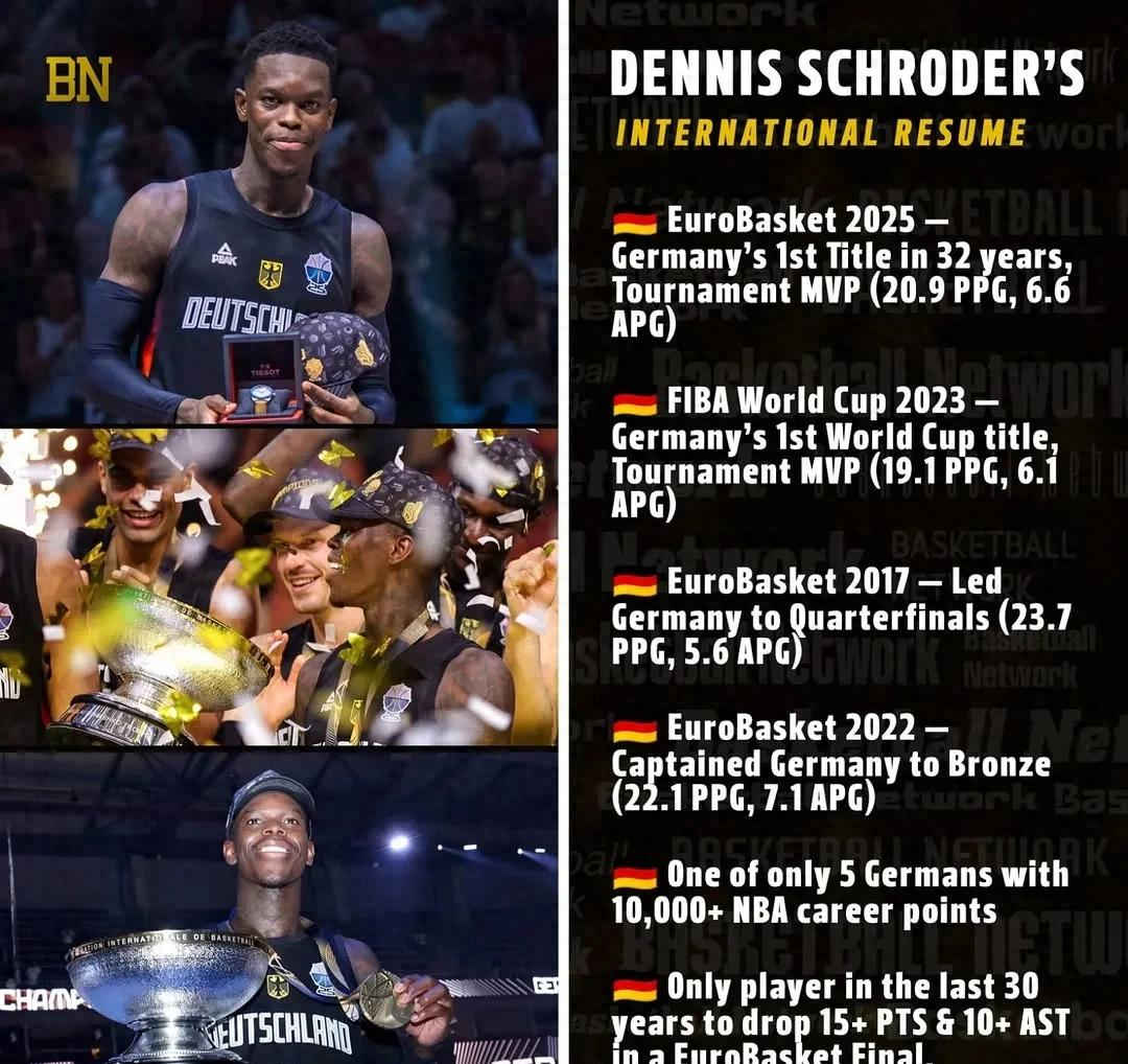 2023年施罗德带队半决赛掀翻美国,决赛砍下28分力克塞尔维亚,夺得队史首个冠军,也因此当选24年巴黎奥运会德国代表团旗手,也是德国历史上首位黑人旗手。