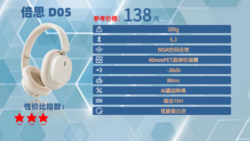 头戴式耳机哪个牌子音质好?这款耳机搭载蓝牙 5.3 芯片,10 米内连接稳定且抗干扰性强,支持双设备同时连接,手机听歌时电脑来电可自动切换,无需手动操作。它仅重 209g,采用 ABS+PC 与金属拼接材质,搭配多档伸缩头梁和灵活金属转轴,耳罩填充记忆海绵并覆盖类肤蛋白皮,戴 2 小时办公或运动也无压头感。音质上,40mm PET 高弹性振膜搭配钕铁硼强磁单元,配合倍思 BISA 空间音效,能营造沉浸式声场,重低音下潜有力,中高频收放自如。46dB 深度主动降噪分三档调节,可精准滤除地铁引擎、办公室键盘等噪音,60ms 低延迟模式适配游戏影音,声画同步流畅。续航更亮眼,70% 音量下可连续播放 70 小时,600mAh 电池经 Type-C 接口 2 小时满电,还保留 3.5mm 有线接口,支持折叠收纳。不过无快充功能,着急出门时无法快速补电。