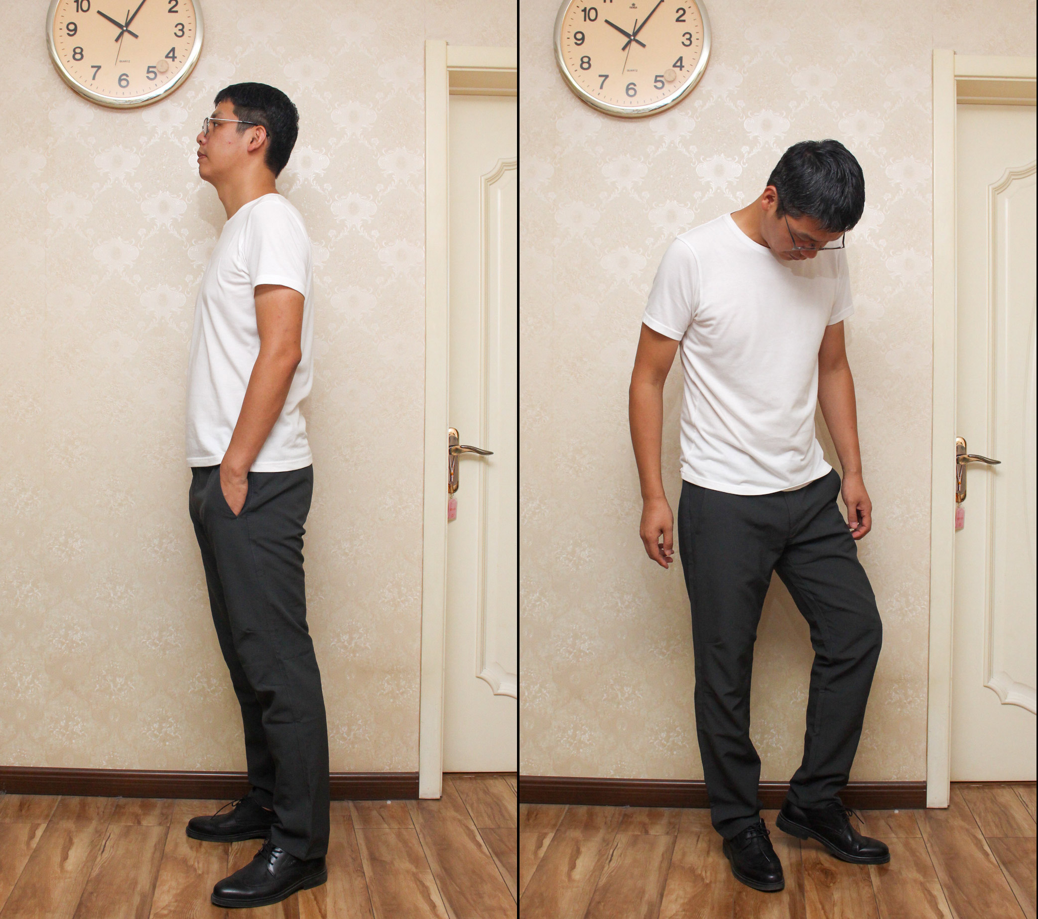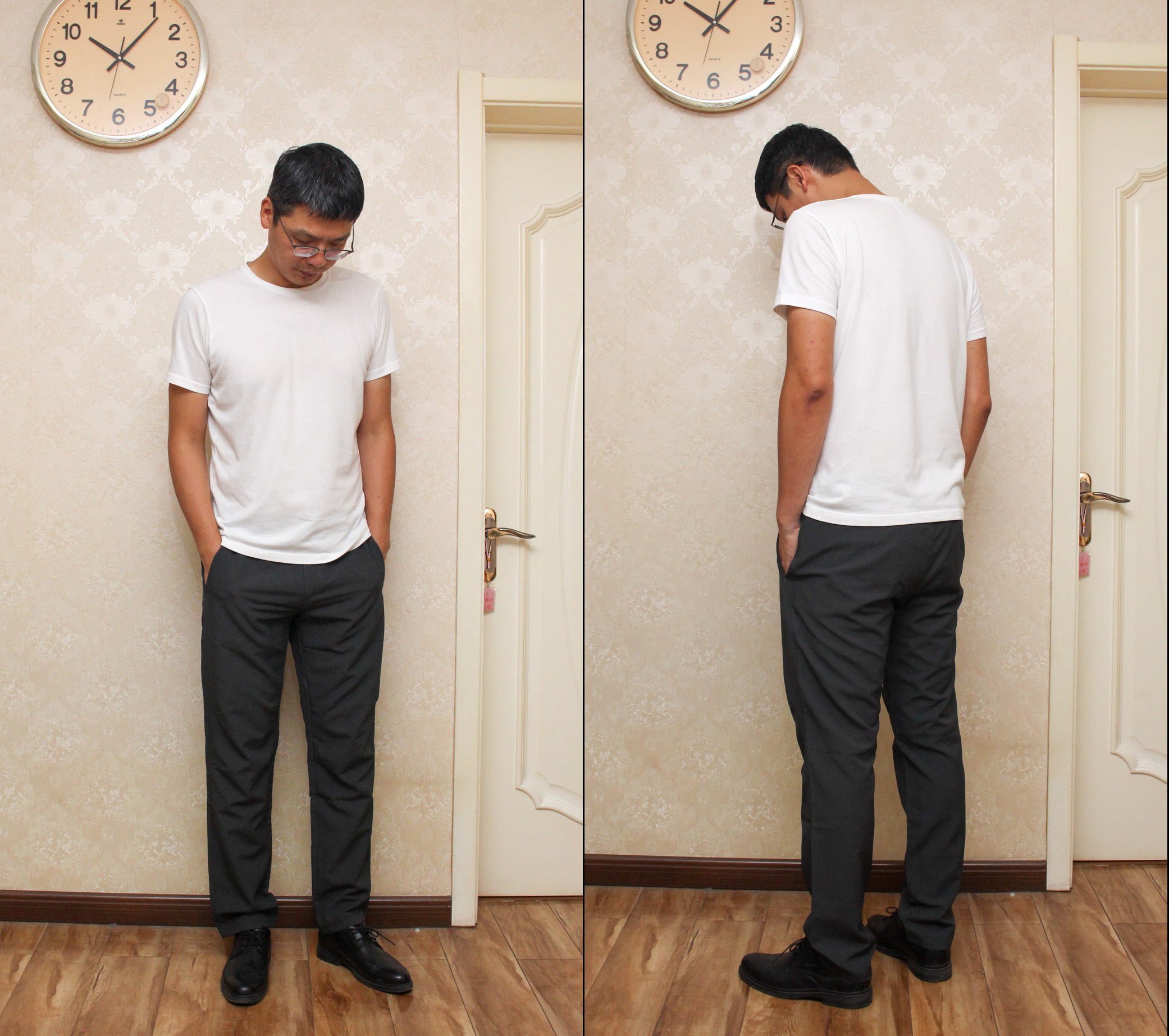 我的大腿是比较粗的,但裤子在大腿位置留了比较大的空间,穿上它之后感觉很舒服。裤子的面料触感很舒适利落,防静电的设计不会有裤腿贴在身上的尴尬。