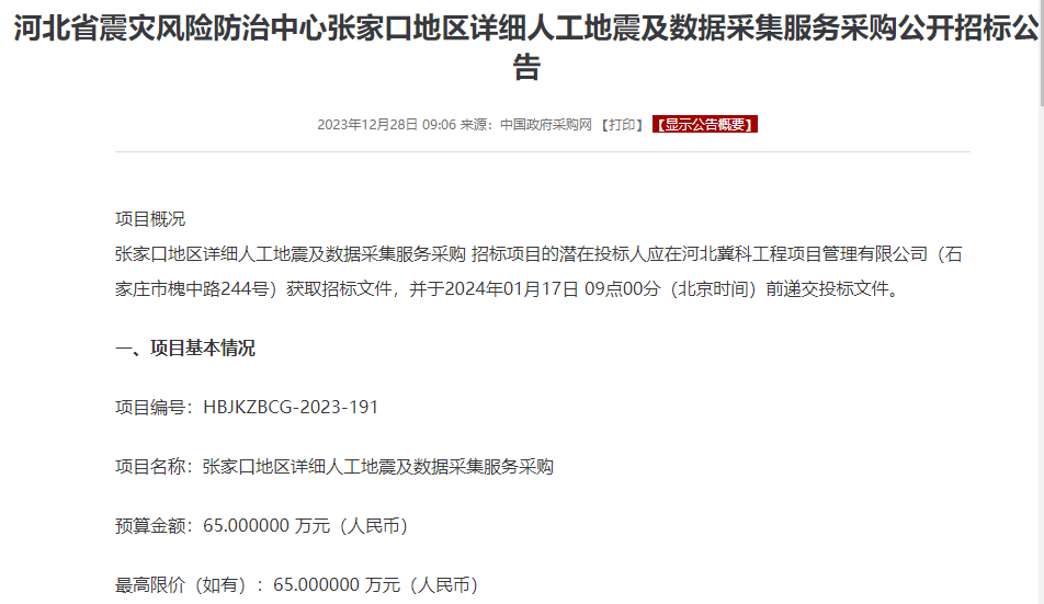 河北省震灾风险防治中心近日发布公告,公开招标一项名为“张家口地区详细人工地震及数据采集服务采购”的项目,项目编号为HBJKZBCG-2023-191。预算金额和最高限价均为65万元人民币。