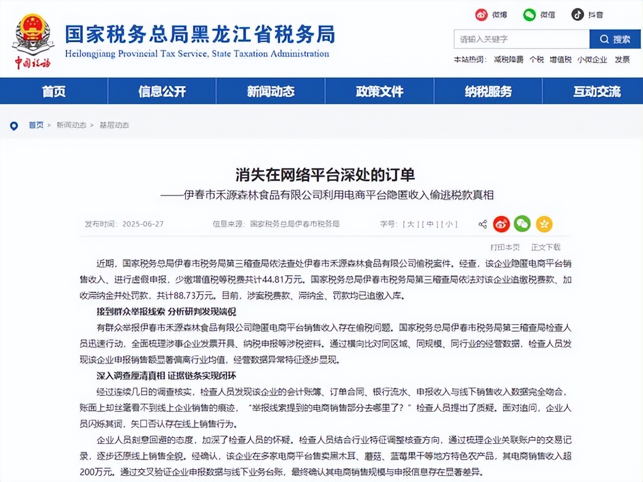 伊春市禾源森林食品有限公司因通过电商平台隐匿销售收入、进行虚假申报,被国家税务总局伊春市税务局第三稽查局查处。该公司少缴增值税等税费44.81万元,最终被依法追缴税款、加收滞纳金并处罚款,合计88.73万元。所有款项均已追缴入库。