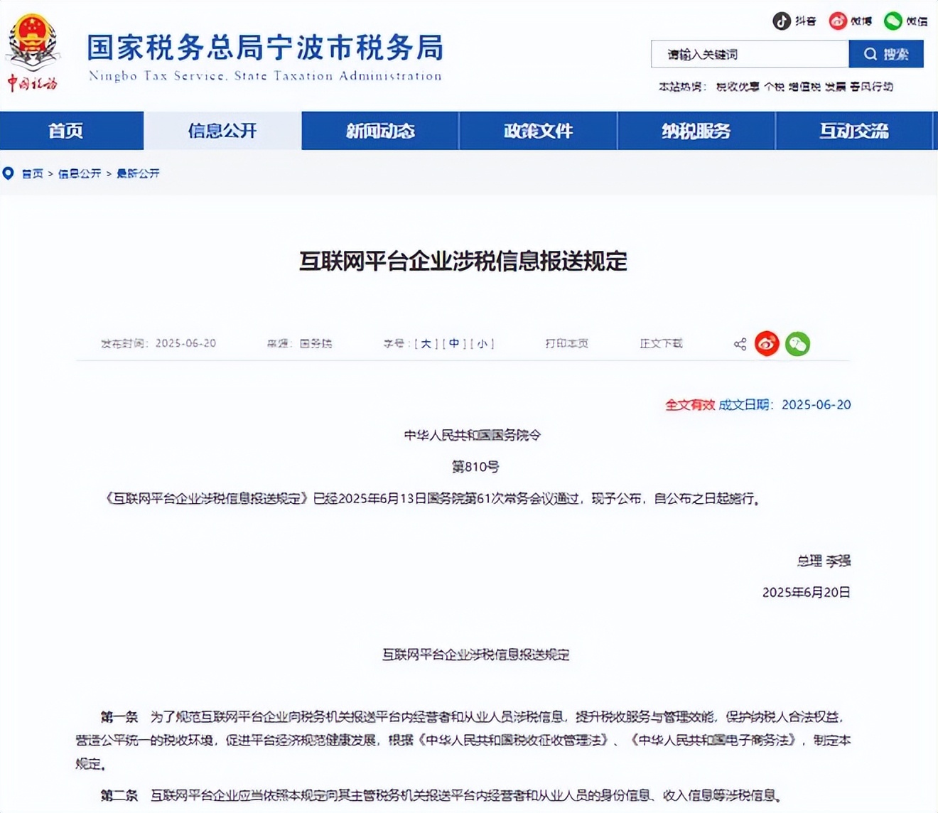 《互联网平台企业涉税信息报送规定》于2025年6月23日正式发布,要求所有电商平台从10月1日起向税务机关报送卖家的销售、退货、订单、物流、人员等各类数据。