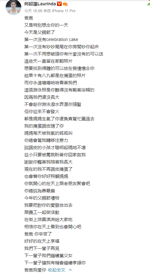 而6月21日,三房女儿,现在风头正劲的何超莲也不甘落后,同样在微博发表了一篇缅怀何鸿燊的文章,大家有兴趣可以先看看内容吧。