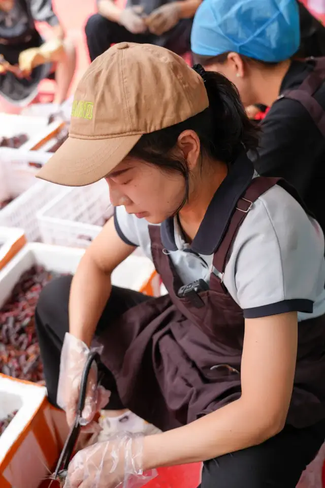 每天上午鲜活小龙虾,进行筛选,一套全员熟悉的流程,浸泡、清洗、剪头去虾囊,客人才能吃到新鲜干净的小龙虾。