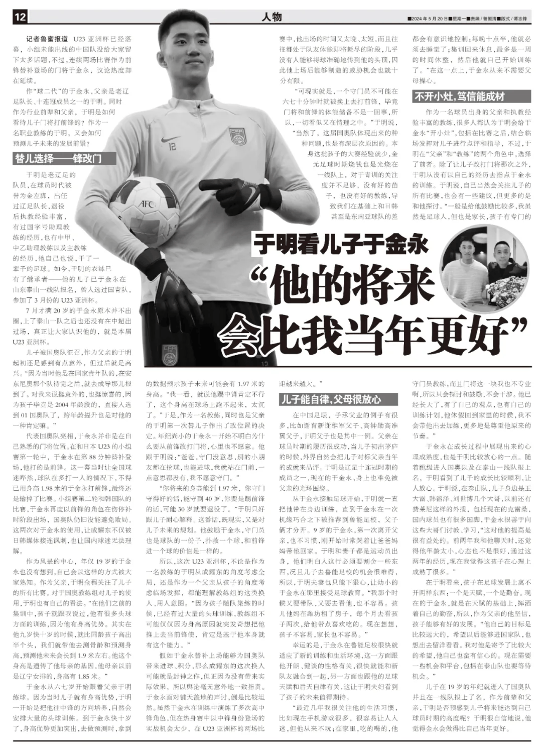 在于明看来,孩子在足球发展上离不开两样东西:一个是天赋,一个是勤奋。现在的于金永,就是在天赋的基础上,挥洒着自己的勤奋,所以,作为父亲的他坚信,孩子能够有好的发展。“他自己的目标是比较远大的,希望以后能够进国家队,也想出去留洋看看。我对他是寄予了比较大的希望,他自己也蛮有信心的。现在需要一些机会和平台,包括在泰山队也要等待机会。”