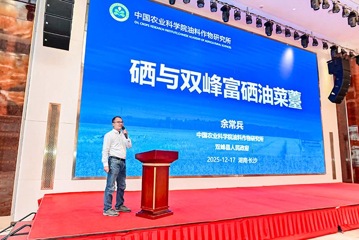 余常兵在会上作《硒与双峰富硒油菜薹》的主题推介发言,从硒的功能与油菜“硒高效”现象、硒高效油菜薹品种的创制及应用、双峰县富硒油菜薹产业发展三个维度作了重点介绍。