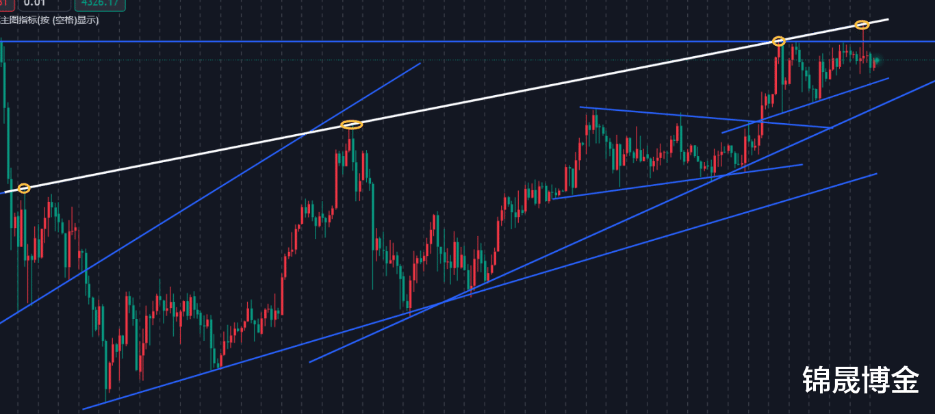 那么在本周数据轮番轰炸下黄金都没能连阳强势站上去,始终压制在4350下方,高位横盘震荡,上下反复洗盘,也符合当前黄金整体的一个震荡上升的节奏。