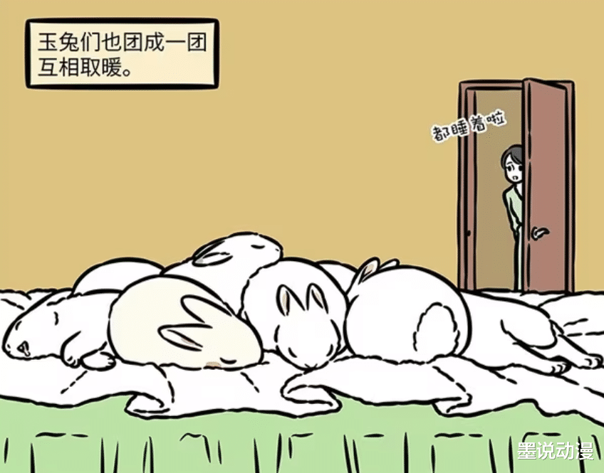 小玉应该是回到了月球,身边有很多玉兔,她跟着其他玉兔们团成一团。农历新年期间,北京还比较冷,抱团取暖能让玉兔们感受到温暖,甚至可以一觉睡到大中午。开门的那个人,应该就是嫦娥,不过她并没有打扰玉兔们休息,毕竟捣药、做月饼一整年,他们也辛苦了。