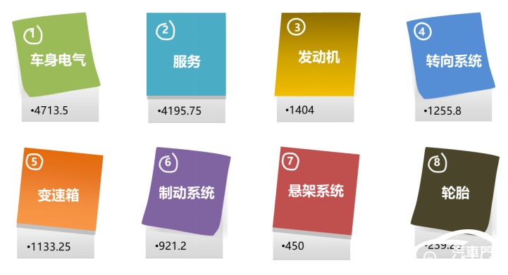 投诉指数:汽车门网全新构建汽车投诉指数计算模型(简称:QCMS),将车型质量投诉分为八大类,根据发动机、变速箱、车身及电气、制动系统、转向系统、悬挂系统、轮胎、服务等问题影响严重性分别赋权,并对集中性事件额外加权,最终形成有效投诉指数,指数越大越严重。
