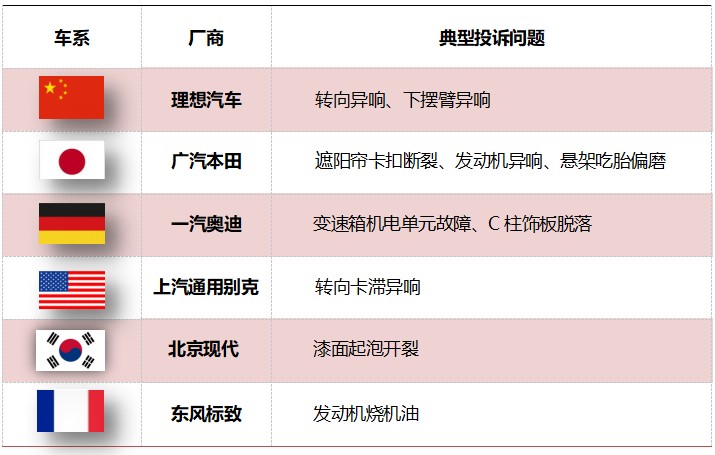 从涉诉车型的国别看,各国车系的投诉占比与以往相同。中国本土车系依然排名第一。值得一提的是,理想、红旗旗下多车的集中投诉声量减弱一定程度上拉低了中国车的整体投诉指数,阿维塔、长安集中投诉上涨又补齐了前者投诉减弱的影响。日系车依然排在第二位,本田多款车型遭遇集中投诉支撑着日系车投诉指数的平稳走势。由于大众、奥迪两大品牌变速箱问题不断,德系车排名第三。在英朗、迈锐宝XL等车型集中投诉抬头的带动下,美系车的投诉指数本月大幅上升,已经接近德系车。
