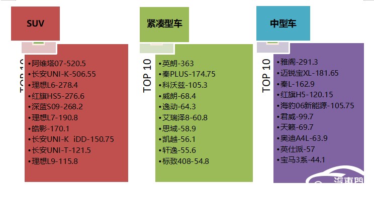 SUV榜单TOP10中,长安旗下四款车型上榜,理想三车入围。阿维塔07强势登顶,老车型停产引发了车主的集中投诉。长安UNI-K紧随其后,车机一直不升级招致了大量老车主的不满。尽管投诉声量减弱,但理想L系列三款车型依然上榜。此外,皓影的遮阳帘卡扣断裂问题本月又遭到了很多车主集中投诉。