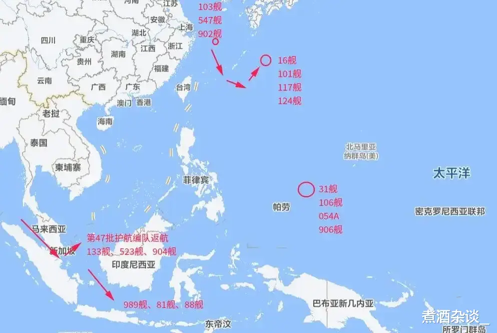 在辽宁舰演训的同时,周边还有075/072/055等多个舰艇编队同时在开展相关科目演练。