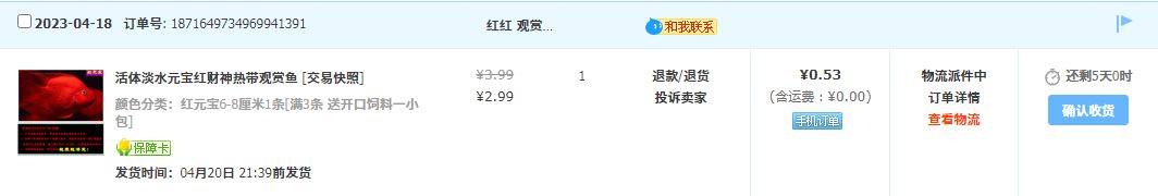 今天薅回来的小红元宝是泡沫保温箱寄过来的,挺大的一个泡沫箱,当时我刚从快递箱拿出来的时候,发现箱子漏水了,一路回家一边滴水,当时心想里面的鱼会不会缺水死了,打开看到打氧的袋子已经瘪了一半了,里面有一条红色的小元宝,在到处乱跑,小鱼还是挺生猛的,网上查了这鱼是血鹦鹉鱼,因体型长的椭圆,体形似个元宝。体态丰满颜色鲜红,像个又大又红的大元宝,因此又叫红元宝、发财鱼或红财神、这次网上薅羊毛没有翻车,血赚了,哈哈。