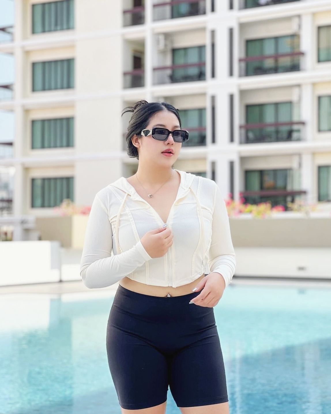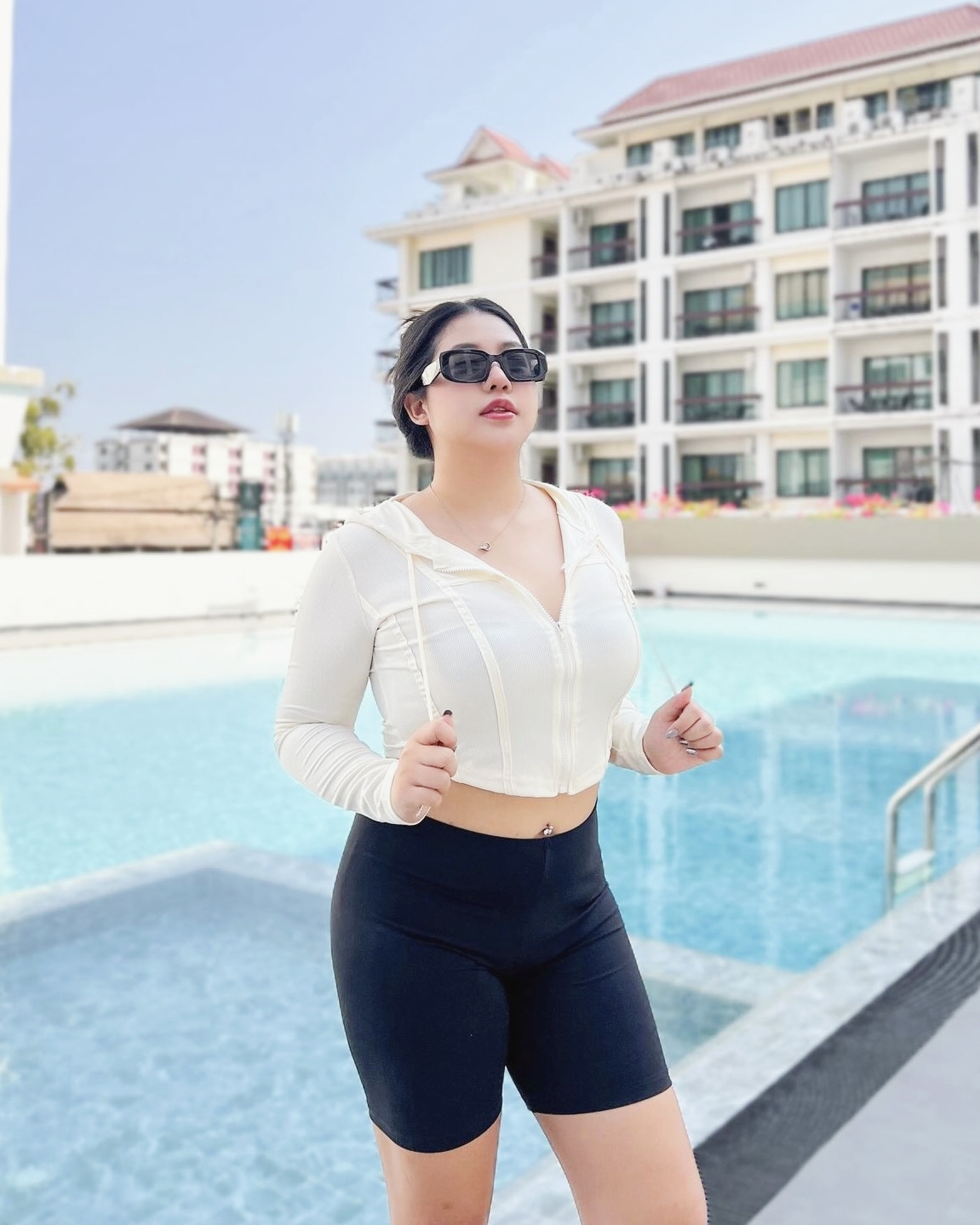 在阳光明媚的午后,室外泳池边,一位丰腴美女以时尚而舒适的穿搭吸引了众人的目光。她上身穿一件米白色长袖防晒上衣,款式修身,领口略开,既展现了她的曲线美,又不失端庄。下身一条黑色短裤恰到好处地露出大腿中部,与上衣形成鲜明对比,更显时尚感。