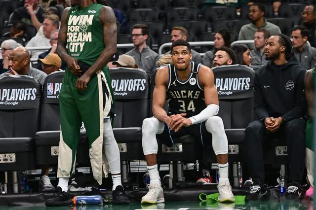 字母哥在周日对阵步行者的第四场比赛最后时刻观战。
