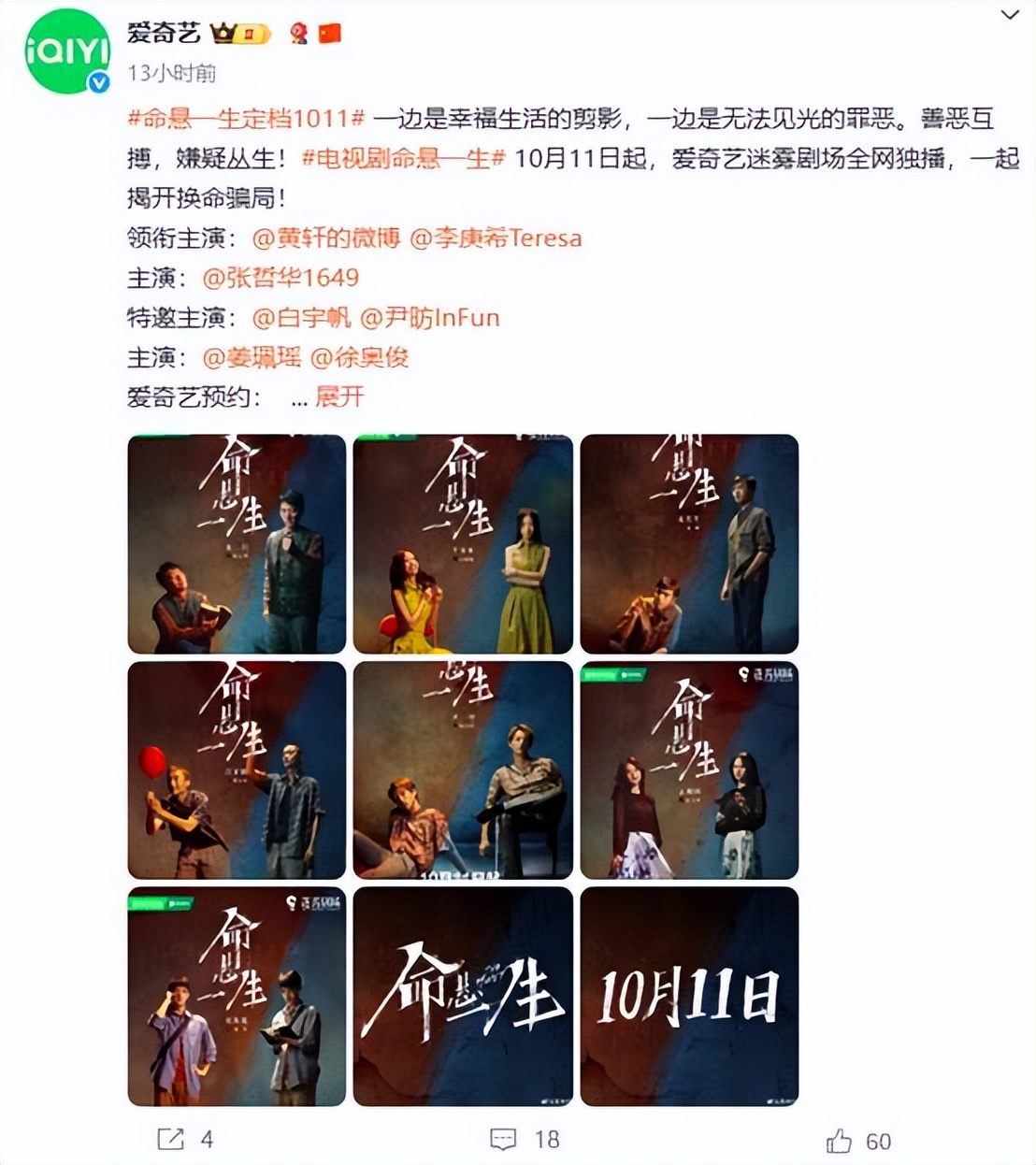 由“国剧标杆”正午阳光出品,实力演员黄轩主演的《命悬一生》已经官宣定档于10月11日晚,奇异果全网独播,让我们敬请期待!