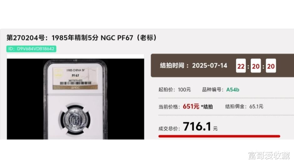 在2025年7月14日的“春秋大拍”中,一枚(老标)评级的1985年“精制5分”,在NGC评级中,评级分数达到了67分,最后拍出了716.1元。足足提升1400多倍!