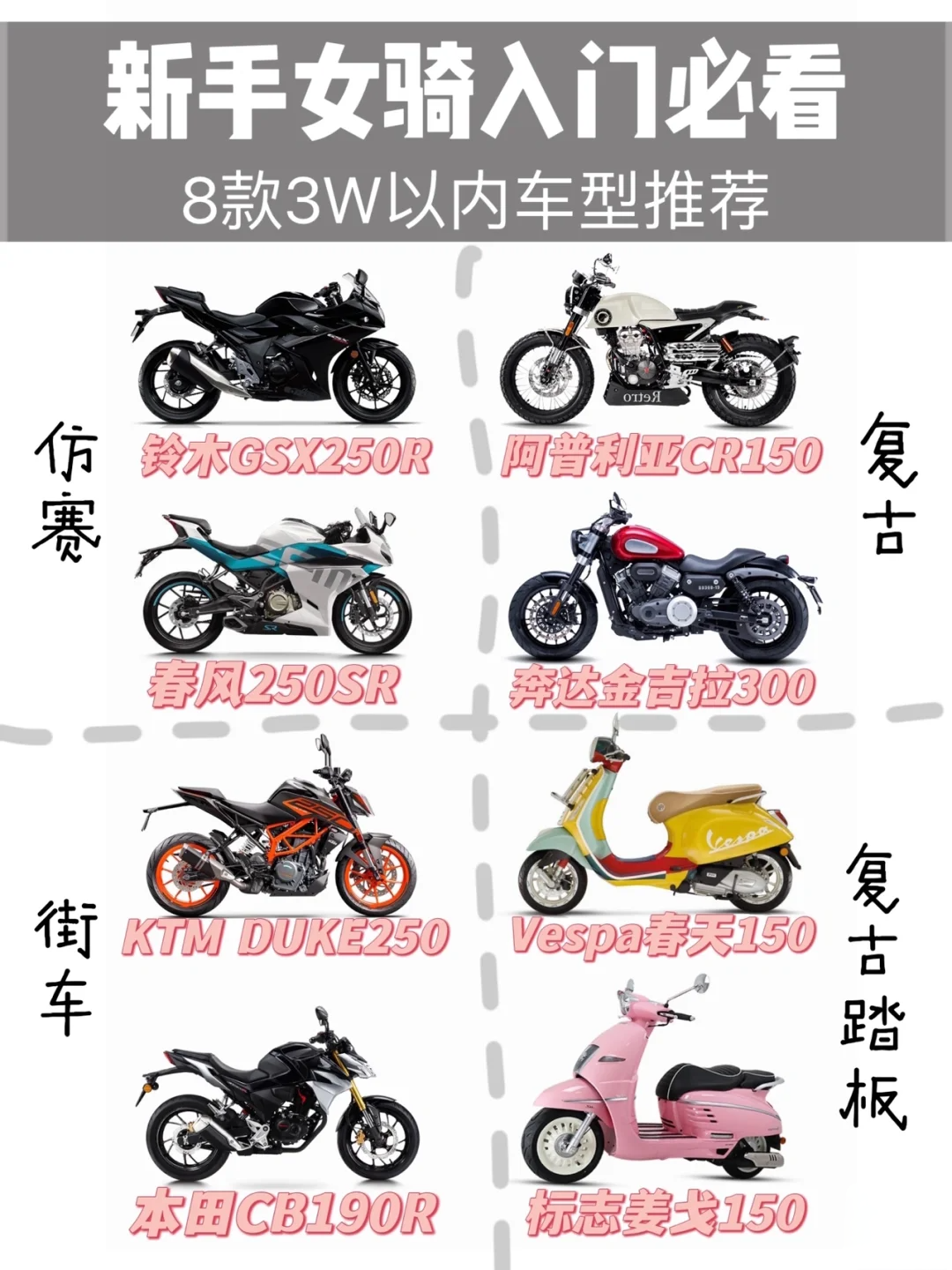 综上所述,这8款车型各有千秋,无论是仿赛的激情四溢、街车的灵动便捷、复古的经典时尚还是复古踏板的优雅舒适,都能满足新手女骑的不同需求。在选择时,除了考虑车型的性能和外观外,还要结合自己的身高、体重和个人喜好来做出最适合自己的选择。毕竟,摩托车不仅是一种交通工具,更是一种生活方式的体现。希望每位新手女骑都能找到属于自己的那款“梦中情车”,开启一段美好的骑行之旅。