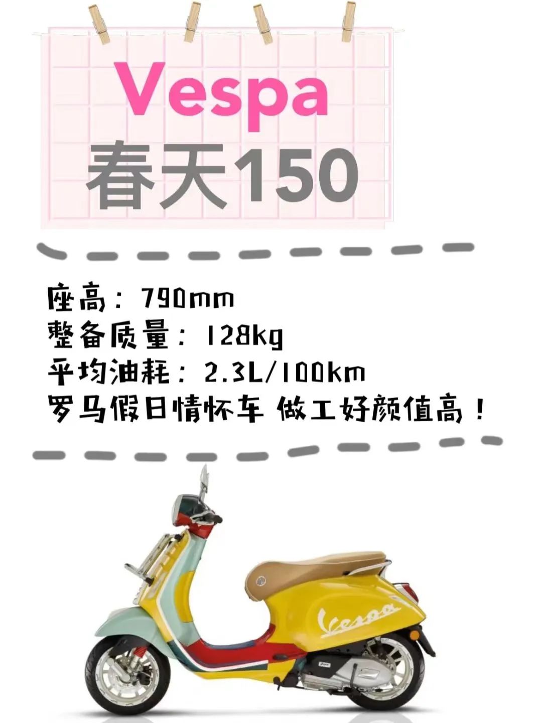 Vespa春天150Vespa春天150以其罗马假日情怀的设计和出色的做工赢得了众多女骑的心。座高790mm,整备质量128kg,平均油耗低至2.3L/100km。这款车的颜值与实用性并存,是城市出行的优雅选择。