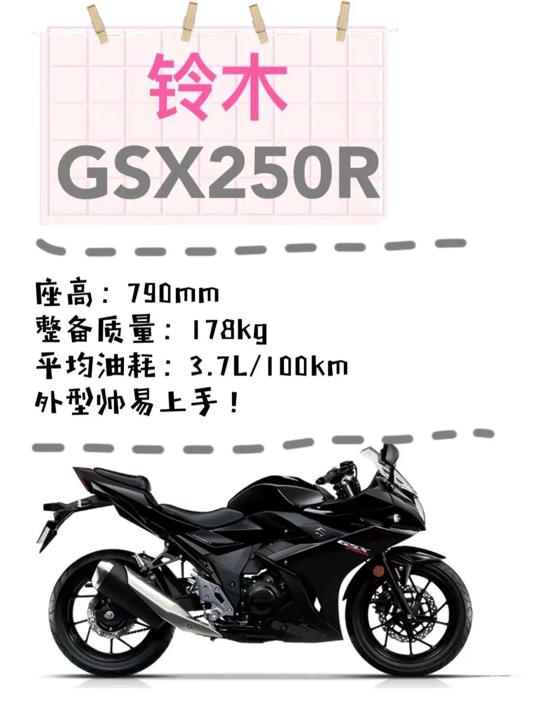 铃木GSX250R铃木GSX250R以其帅气的外型和易上手的特点,深受新手骑士的喜爱。座高790mm,整备质量178kg,平均油耗3.7L/100km。这款车的外观设计充满了运动感,同时操控性也非常出色,是仿赛入门的不二之选。
