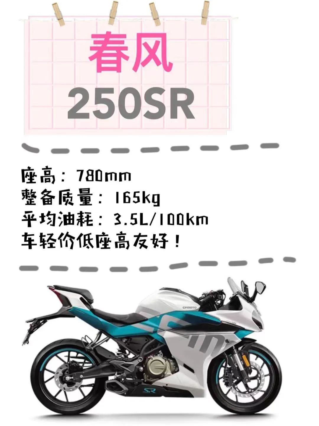 春风250SR春风250SR以其轻盈的车身和友好的座高(780mm)赢得了众多女骑的青睐。整备质量仅为165kg,平均油耗3.5L/100km。这款车的动力表现平稳,操控灵活,非常适合新手女骑。