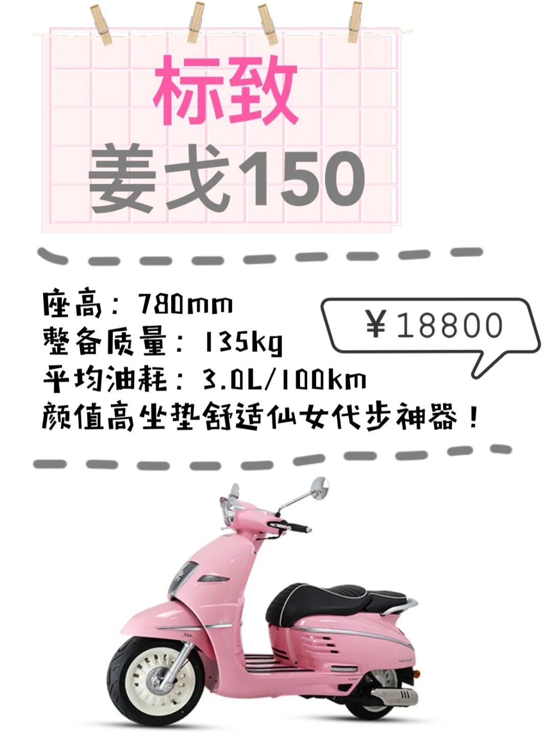 标致姜戈150标致姜戈150以其高颜值和舒适的坐垫成为仙女代步的神器。座高780mm,整备质量135kg,平均油耗3.0L/100km。这款车的外观设计时尚大方,骑行起来既舒适又稳定。