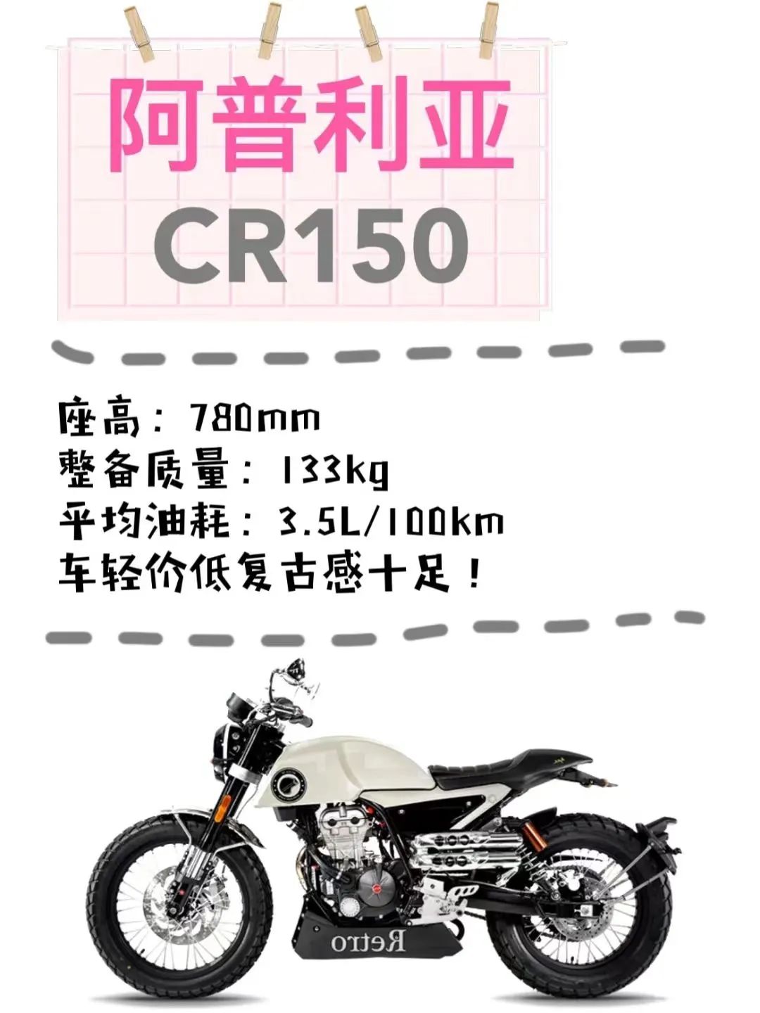 阿普利亚CR150阿普利亚CR150以其复古感十足的设计和轻盈的车身(整备质量133kg)吸引了众多女骑的目光。座高780mm,平均油耗3.5L/100km。这款车的价格亲民,同时又不失时尚感,是复古入门的好选择。