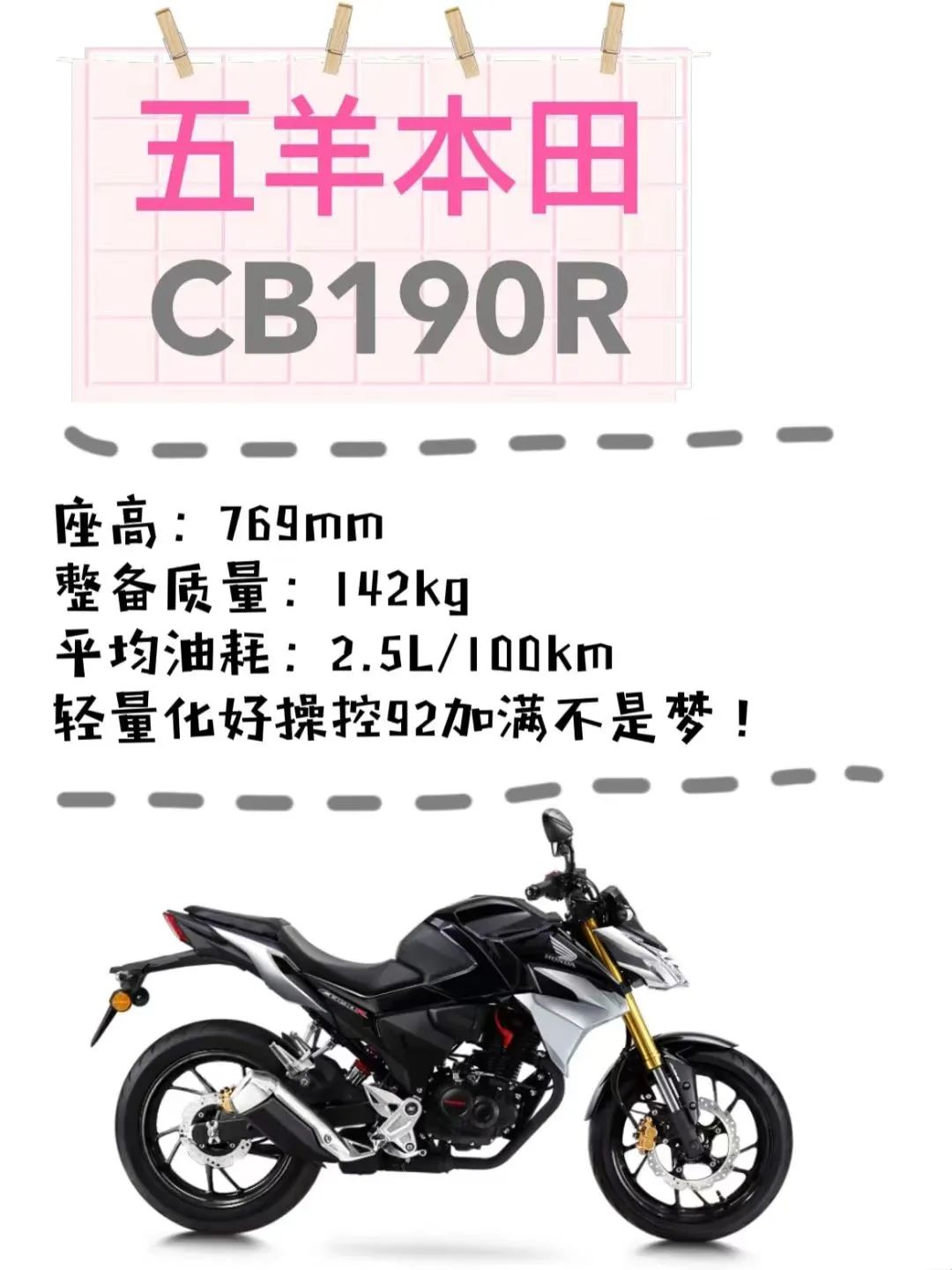 本田CB190R本田CB190R以其轻量化好操控的特点,深受新手喜爱。座高769mm,整备质量142kg,平均油耗更是低至2.5L/100km。这款车的经济性极佳,92号汽油加满即可轻松上路,是城市通勤的绝佳选择。
