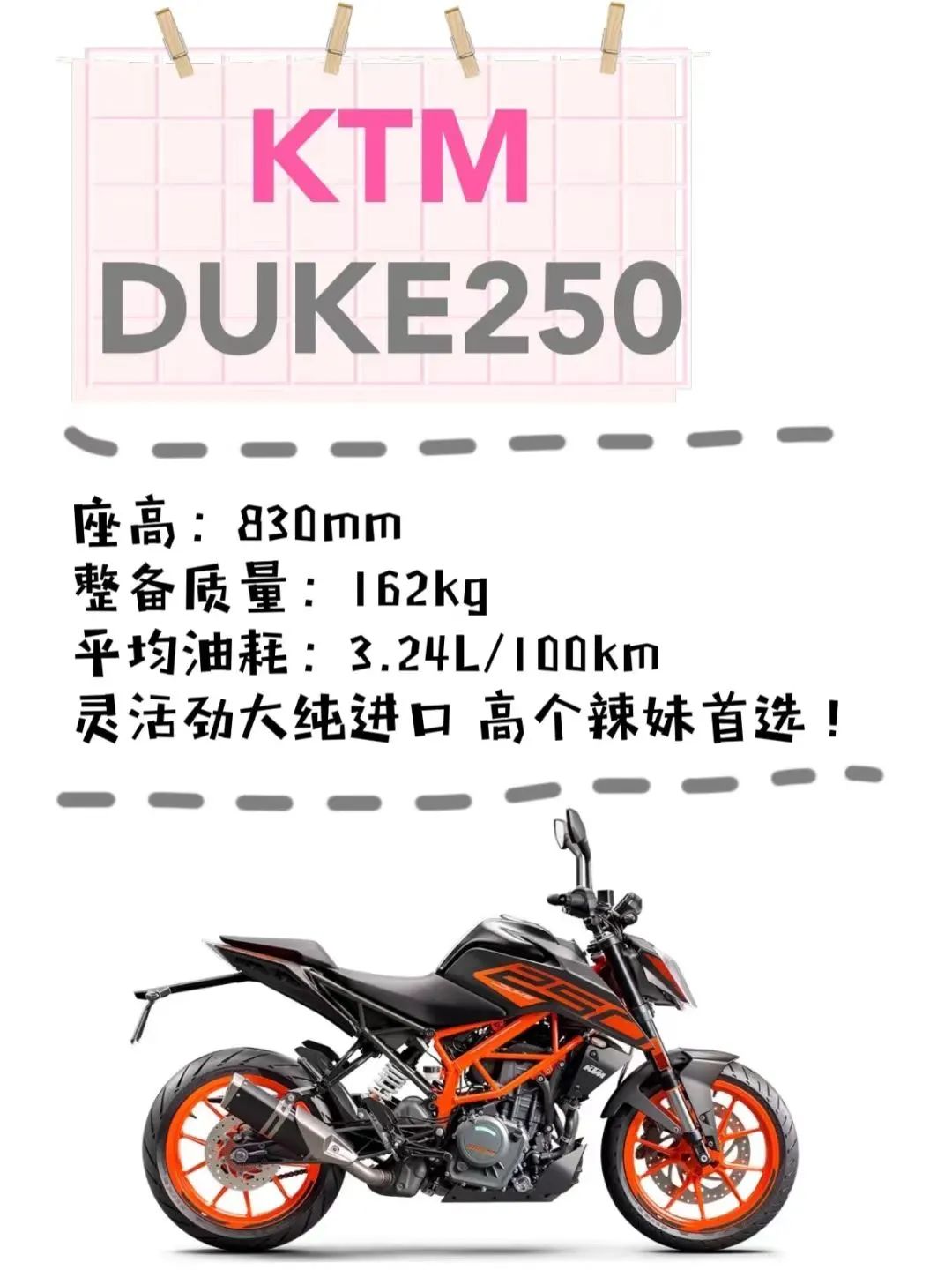 KTM DUKE250KTM DUKE250以其灵活劲大的特点,成为高个辣妹的首选。座高830mm,整备质量162kg,平均油耗3.24L/100km。这款车是纯进口车型,品质有保障,同时在城市穿梭中也能展现出其独特的魅力。