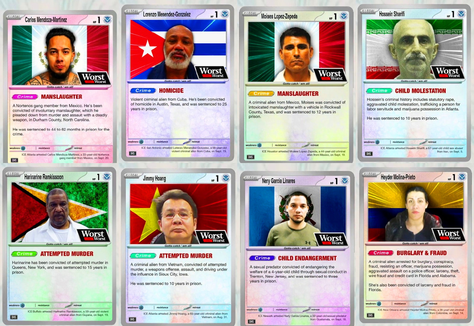 值得一提的是:影片结尾的地方,国土安全部还将移民与海关执法局(ICE)逮捕的通缉犯嫌疑人制作成宝可梦卡牌(PTCG)的样式,非常带感!卡牌上展示了罪犯的样貌,还描述了具体罪行;这是不是发错地方了呢?还真不是,同样的影片同时发布于多个知名社群平台上,显然在进行某种宣传活动,只不过宣传的方式让大家颇为意外。