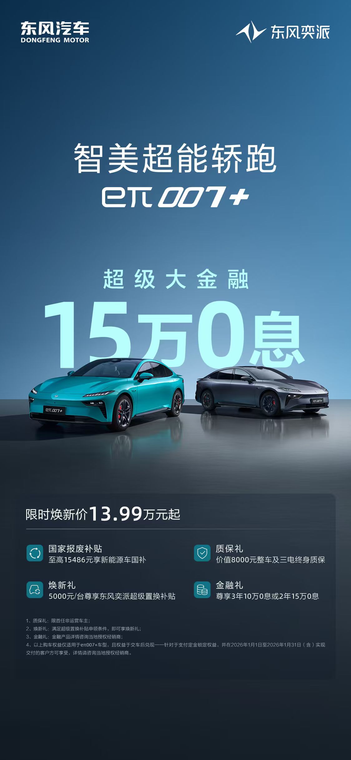 智能加码,福利也不缺席:eπ007+限时13.99万元起,享“15万元2年0息”“10万元3年0息”金融方案,降低购车门槛。置换补贴5000元、至高15486元国家报废补贴、8000元终身质保三重福利叠加,用车更无忧。此外,奕派eπ00711.59万元起享至高4万元权益,为预算有限的年轻人提供更多选择。