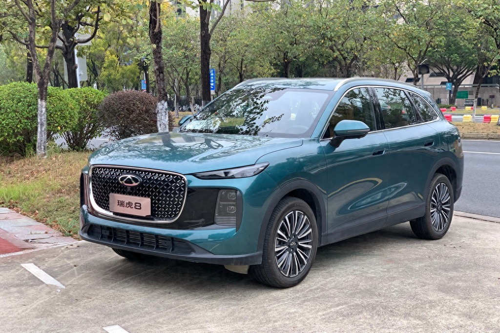 大家都知道,这一次瑞虎8是推出了虎款、豹款两种造型风格可选,同时对应的座舱布局也有明显差异。这次我们试驾的第五代瑞虎8豹款在外观造型上其实更像是一台新能源产品,你看车头这个圆润的中网造型,搭配上分体式灯组以及包围两侧的黑色饰板点缀,真的是电感十足。
