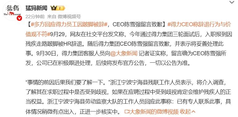 9月29日,有网友在社交网站发帖称,自己通过得力集团三轮面试后,在入职报到当天因为走路跛脚问题被辞退。