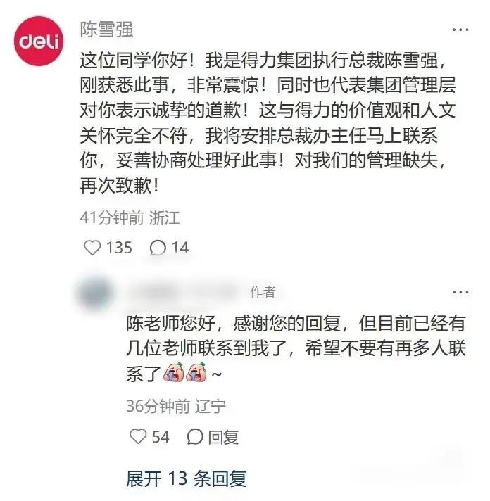 值得一提的是,之后有自称“得力集团执行总裁陈雪强”的网友在其评论区留言称:“刚获悉此事,非常震惊!同时也代表集团管理层对你表示诚挚的道歉!这与得力的价值观和人文关怀完全不符,我将安排总裁办主任马上联系你,妥善协商处理好此事!对我们的管理缺失再次致歉!”
