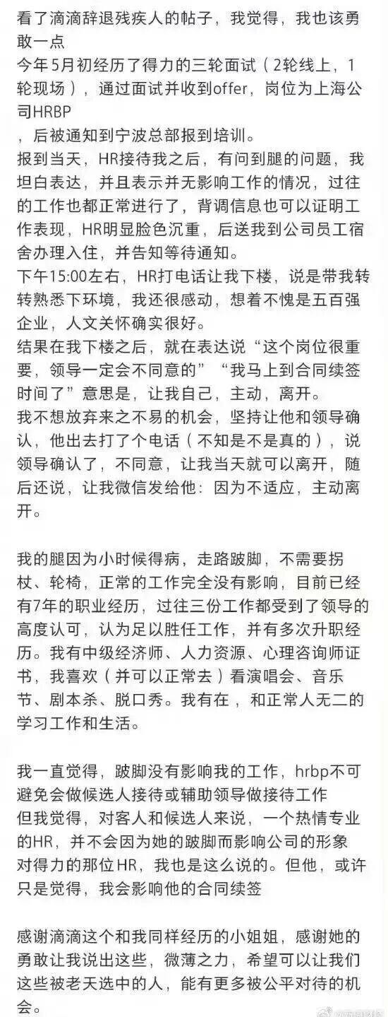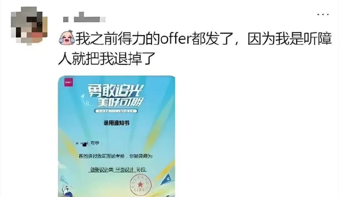 02.值得一提的是,跛脚网友被辞退的事件或许并非个例;另有网友在社媒爆料称,自己原本得到了得力的offer,但因为是听障人士,也被取消了录用资格。