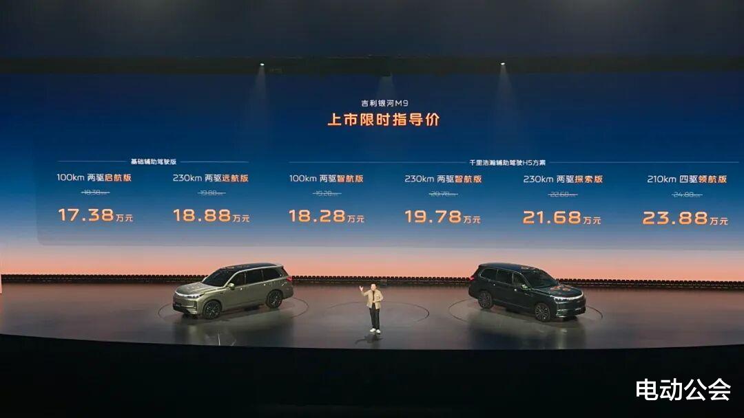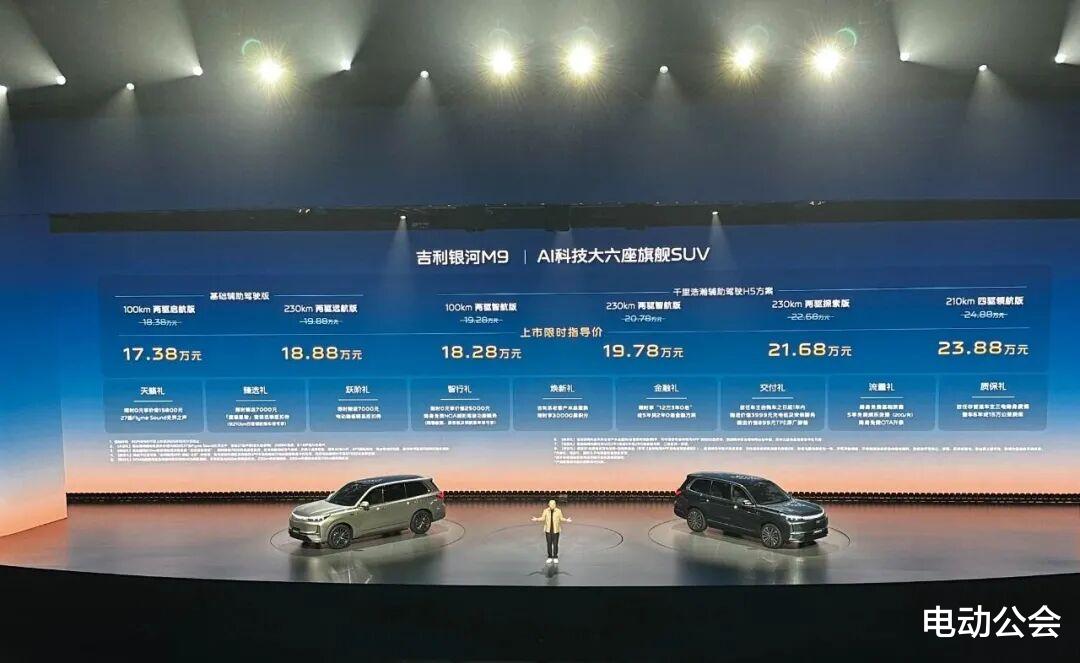 9月17日,吉利银河AI科技大六座旗舰SUV——银河M9正式上市,新车共推出6个版型,限时售价17.38万-23.88万元,这个起售价比之前19.38万的预售价又降了2万元,远远低于业内预期。