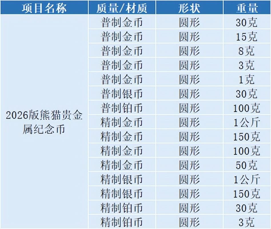 按央行的发行计划,2026年熊猫纪念币将在10月发行,一共发行15种规格,包含9枚金币,3枚铂币和3枚银币。