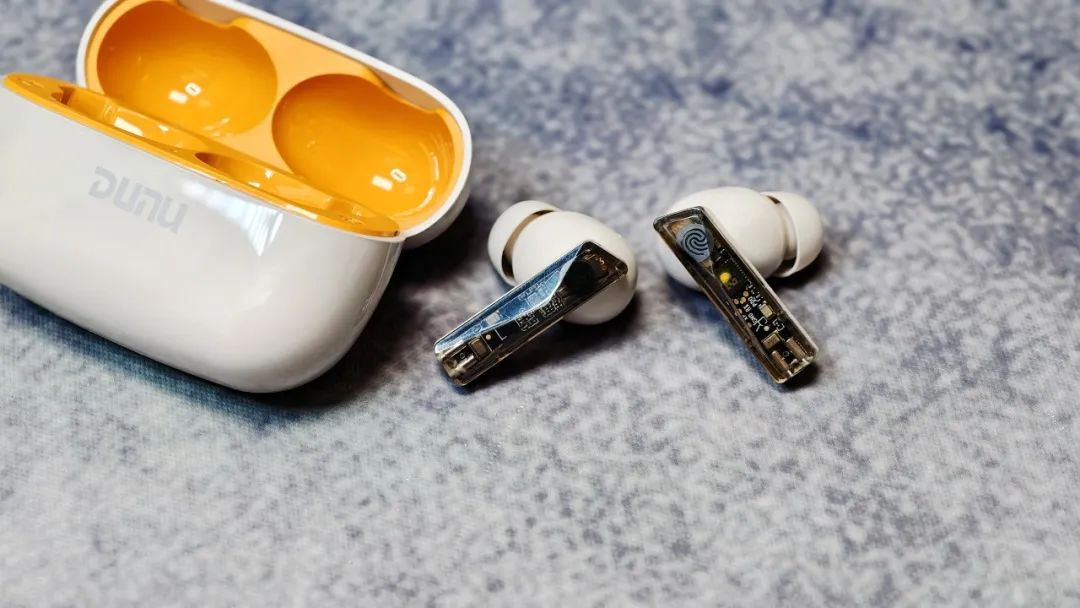 外观嘛,达音科DTW300用了个比较常规的造型,这意味着它在佩戴感上会比较普适,正常人一看就知道咋带咋用,实际上戴起来舒适度也蛮可以,耳塞柄上部是触控操作区,然后在一个常规造型的基础上,搭色搭得很给力,杏黄色的内衬鲜活感一下子就出来了,更漂亮的是这个耳塞柄——半透明视窗可见电路板的搞法,搭配耳塞柄上设计感和手感都很不错的棱线,相当吸睛,相当好看!