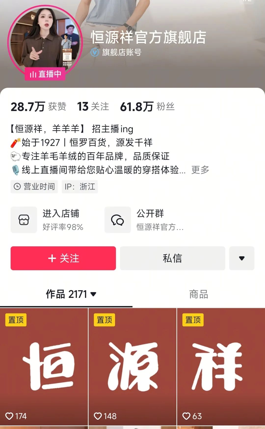 比如,2024年底的恒源祥直播间,因为女主播的性感穿搭而爆火,恒源祥官方旗舰店,月销超过了1700万元。