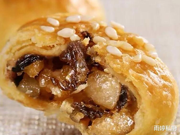 金灿灿的饼皮,看着就流口水,阳光一照,亮得晃眼!送进嘴里,“咔嚓、咔嚓”像嚼香脆饼干,酥得掉渣,碎屑沾满嘴角也不管不顾。肉香浓郁得直冲鼻腔,梅干菜香迷人,带着一丝丝咸甜交融的回味,吃一次就彻底爱上了,每次想起都忍不住舔嘴唇,回味无穷!