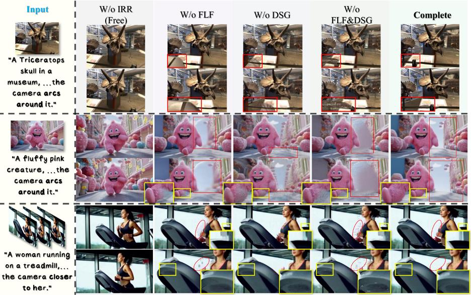 IRR 模块为此引入了一种巧妙的步内递归优化机制:在每一步的推理过程中,首先让模型自由预测下一刻的内容,然后识别出画面中参考内容存在的 “已知区域”,并用真实内容替换掉模型的预测。通过这种增量式的逐步校正,IRR 能在每一步有效注入轨迹控制信号,避免轨迹逐步漂移。